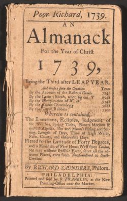 But, I digress. One of the reasons I chose the name "Poor Richard's Almanack" was a way of getting the reader to remember my product. Poor Richard was a unique title and one strategy of getting my customers to re-order the book year after year. A second strategy was to prolong its useable life by filling it with aphorisms and proverbs. Almost no one would dispose of my Almanack during its useage cycle - a year. Many kept it around permanently. I salted it with witty sayings and memorable homilies. Some of my maxims are still in use during your life time. "A penny saved is a penny earned", etc. etc.